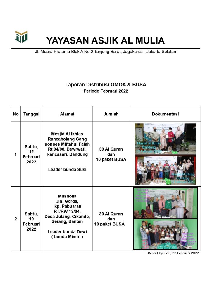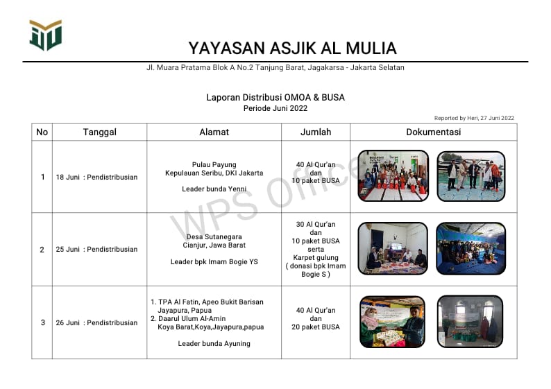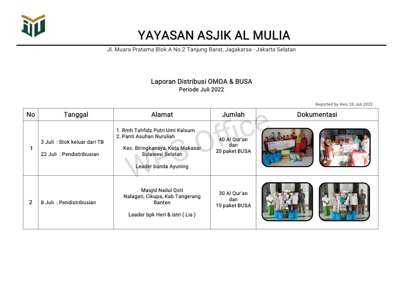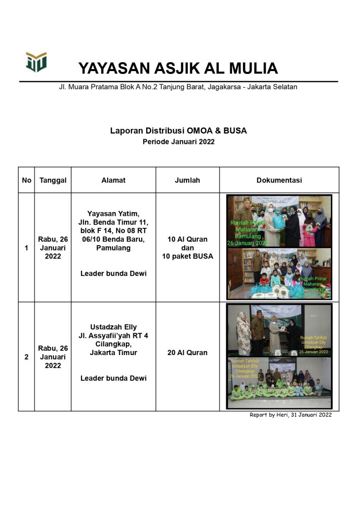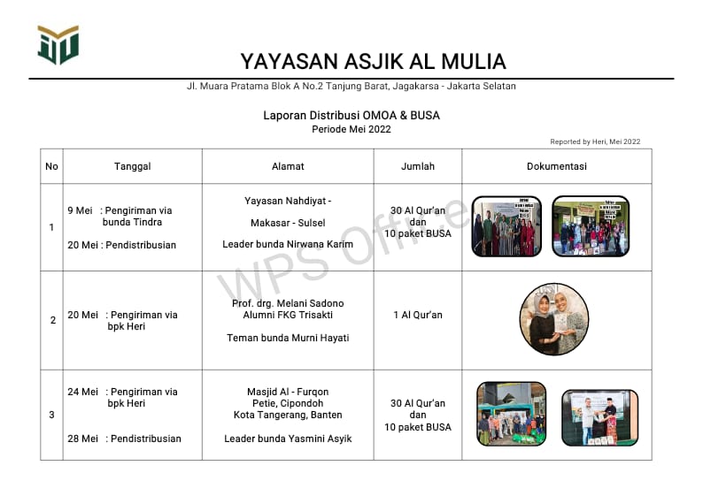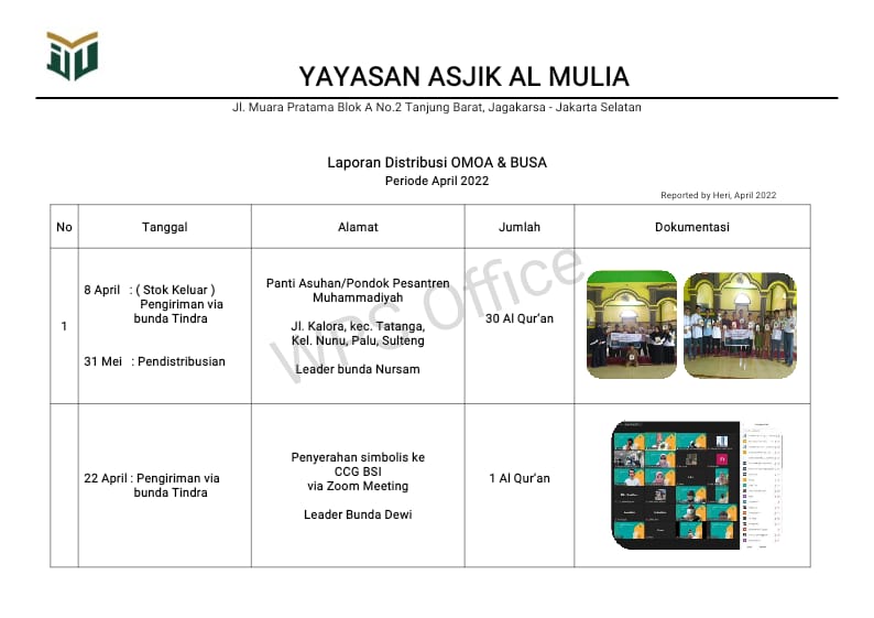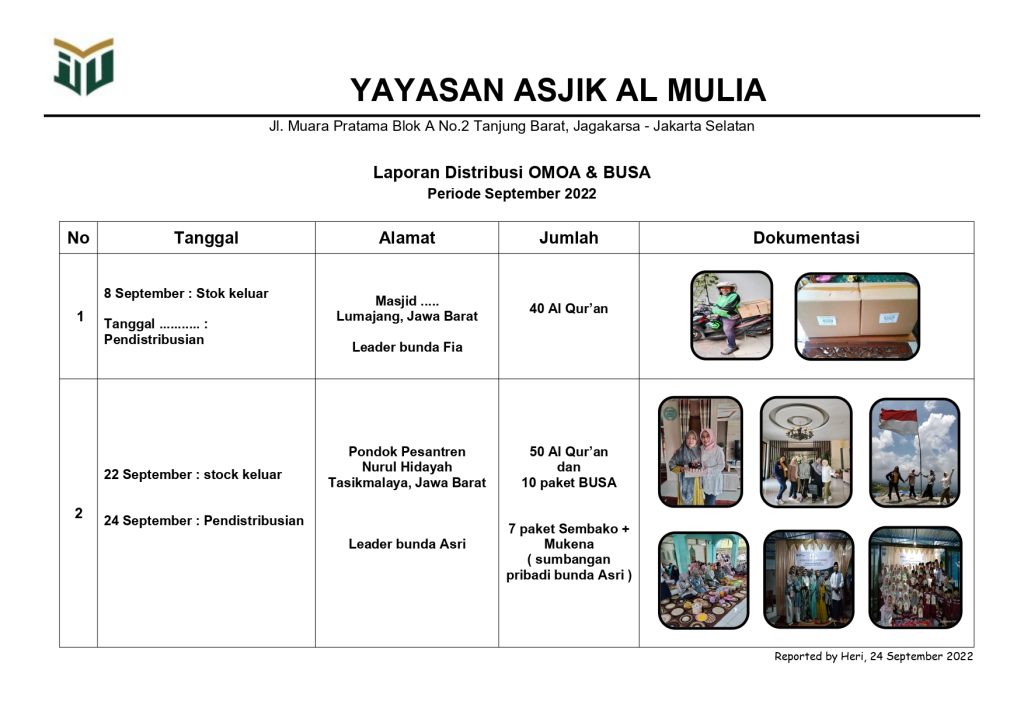 Laporan pertanggung jawaban kegiatan pada hakekatnya sangatlah diperlukan bagi setiap organisasi, instansi pemerintah, ataupun komunitas yang telah mendapatkan dana bantuan atas kegiatan yang dilakukan. Insha Allah kami dari Yayasan Asjik Al Mulia secara sadar dan benar telah membuat laporan.